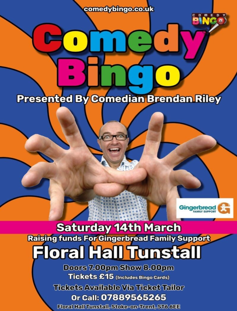 The Gingerbread Centre are hosting a Comedy Bingo Night with the brilliant Brendan Riley at the Floral Hall, Tunstall Park on Saturday 14th March 2026 — so expect plenty of laughs, bingo prizes, and the chance to prove once and for all that you're the bingo champ of Stoke-on-Trent!